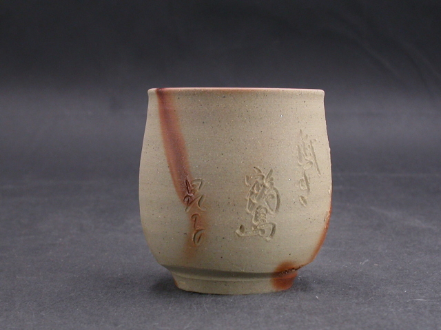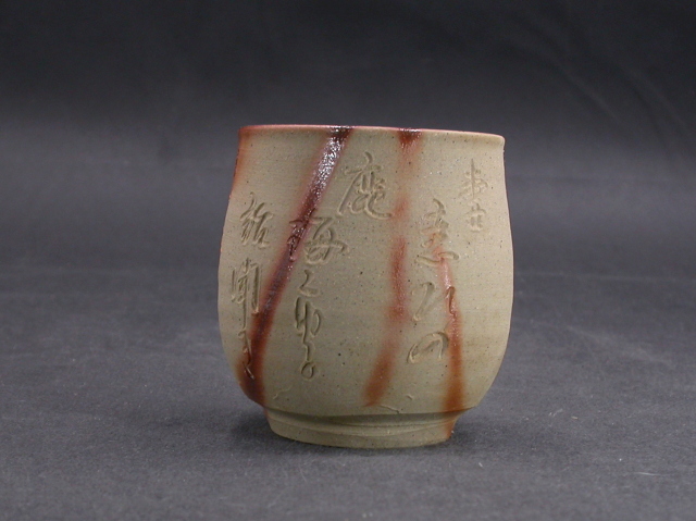 昭和22年創業。日用品を中心に幅広く作ります。この湯呑は端正な作りに、焼けは良く焼き締まった地肌に緋襷が掛かり良い雰囲気の作品となっています。与謝野晶子が備前市日生の島々を題材に読んだ詩が彫られています。高さ約7.2センチ、径約6.5センチ。送料は地域別送料です。別注品を除く5,000円以上のお買上げで送料500円。 別注品を除く10,000円以上のお買上げで送料無料にさせていただきます。 ※離島にお住まいの方は別途ご連絡いたします。