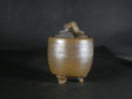昭和26年岡山県生まれ。備前焼に惹かれ備前陶芸センター卒業後人間国宝山本陶秀・岡山県無形文化財山本雄一親子に師事。県展他入賞。陶秀の陶技・焼成を良く受け継ぎ陶秀譲りのろくろ技術と紐造り・面取等多彩な造形で人気があります。この香炉は今回窯出しの最新作で小振りながら雰囲気のある作りに、焼けは還元で青黒く良く焼き締まった地肌に鮮やかな金彩と青・焦げ茶・焦げのゴマが掛かり良い雰囲気の作品となっています。香炉として使う時は蓋を取って使ってください。高さ約10センチ、径約7.5センチ。栞付き。送料は地域別送料です。別注品を除く5,000円以上のお買上げで送料500円。 別注品を除く10,000円以上のお買上げで送料無料にさせていただきます。 ※離島にお住まいの方は別途ご連絡いたします。