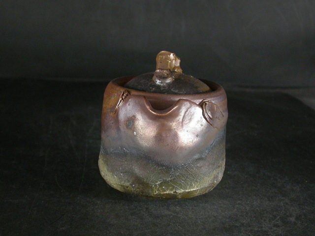昭和26年岡山県生まれ。備前焼に惹かれ備前陶芸センター卒業後人間国宝山本陶秀・岡山県無形文化財山本雄一親子に師事。県展他入賞。陶秀の陶技・焼成を良く受け継ぎ陶秀譲りのろくろ技術と紐造り・面取等多彩な造形で人気があります。この宝瓶は今回窯出しの最新作で雰囲気のある作りに、焼けは良く焼き締まった地肌に鮮やかな金彩と黄・青・焦げ茶・焦げのゴマがたっぶりと掛かり良い雰囲気の作品となっています。高さ約8.2センチ、径約7.5センチ、口までの幅約9.5センチ。栞付き。 送料は地域別送料です。別注品を除く5,000円以上のお買上げで送料500円。 別注品を除く10,000円以上のお買上げで送料無料にさせていただきます。 ※離島にお住まいの方は別途ご連絡いたします。