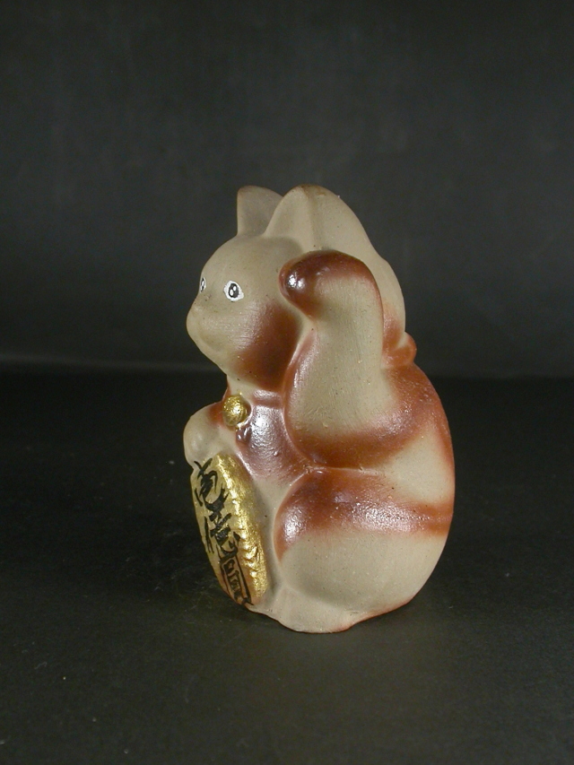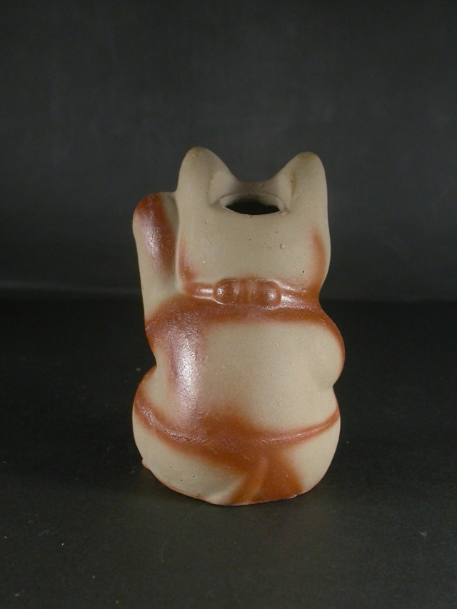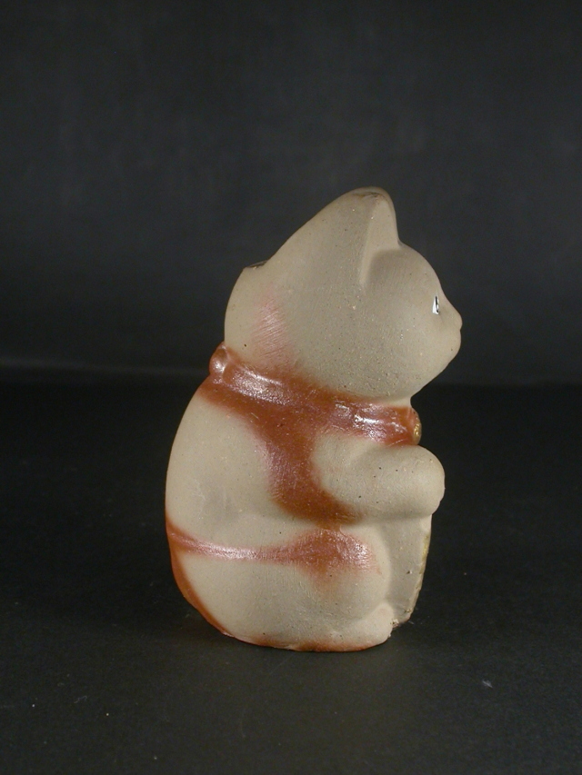 昭和23年滋賀県生まれ。中部大学卒業後洋食器メーカーに入社。その後備前焼に魅せられ備前焼作家三村陶伯に師事。昭和54年窯を築いて独立。県展他入賞多数。使いやすい食器を中心に造り人気があります。この招き猫は雰囲気のある作りに、焼けは良く焼き締まった地肌に緋襷が掛かり良い雰囲気の作品だと思います。高さ約11センチ、径約6.5から7センチ。栞付き。