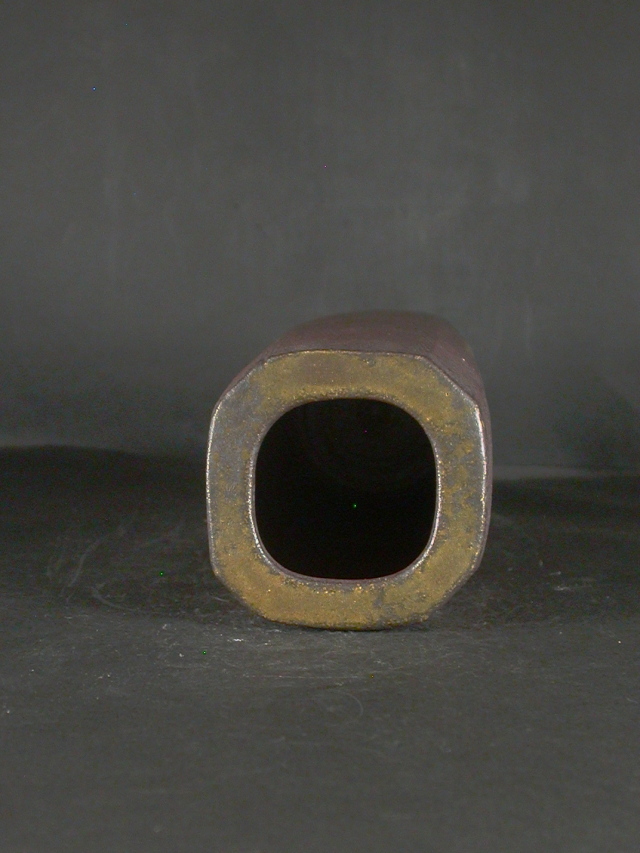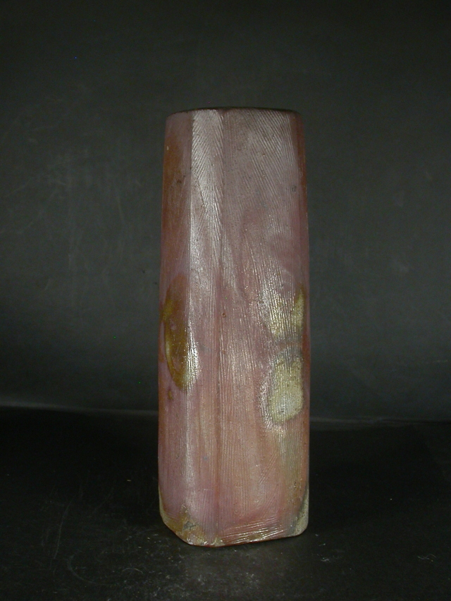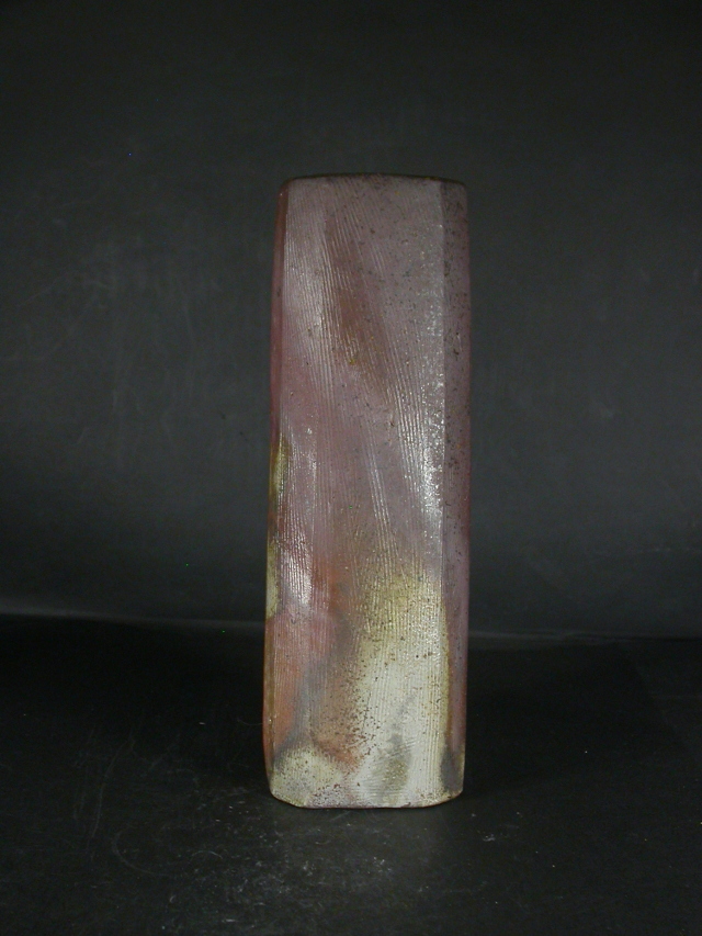 昭和17年岡山県生まれ。独自に修行後窯を築いて独立。岡山県無形文化財。手捻り・型成型で独特の細工物を中心に作り人気が有ります。この花入は雰囲気のある作りに、焼けは良く焼き締まった地肌に桟切と黄・焦げ茶のゴマが掛かり良い雰囲気の作品となっています。共箱に少し自然の焼けが有ります。高さ約22.7センチ、径約8センチ角。共箱・栞付き。送料は地域別送料です。別注品を除く5,000円以上のお買上げで送料500円。 別注品を除く10,000円以上のお買上げで送料無料にさせていただきます。 ※離島にお住まいの方は別途ご連絡いたします。