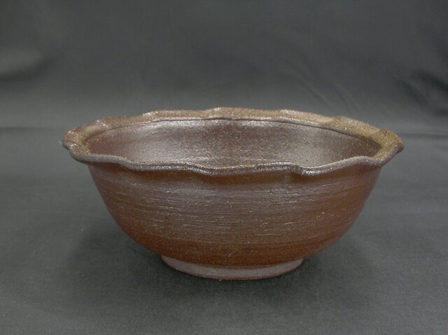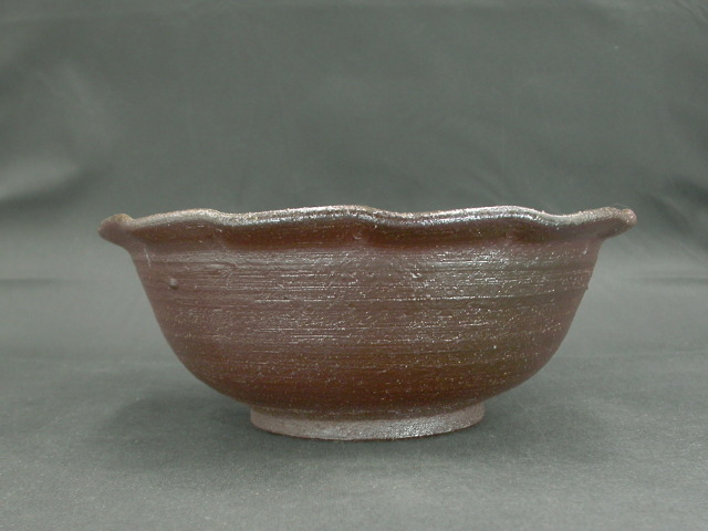 年東京都生まれ。玉川大学陶芸科卒業後備前市無形文化財榊原清人に師事。平成9年窯を築いて独立。日本伝統工芸展他入賞多数。日本工芸会正会員。この大鉢は水盤としても良い作りに、焼けは良く焼き締まった地肌に黄・焦げ茶のゴマと緋襷が掛かり良い雰囲気の作品となっています。高さ約10センチ、径約24.5センチ。